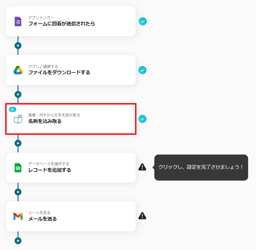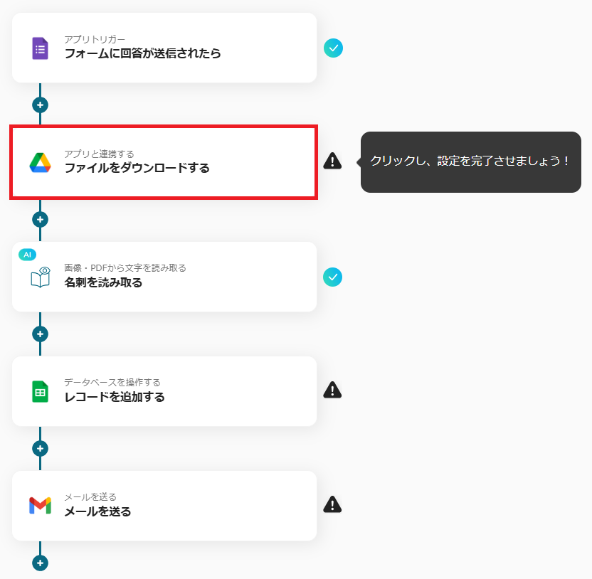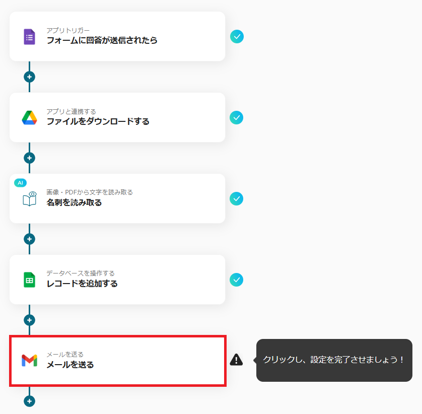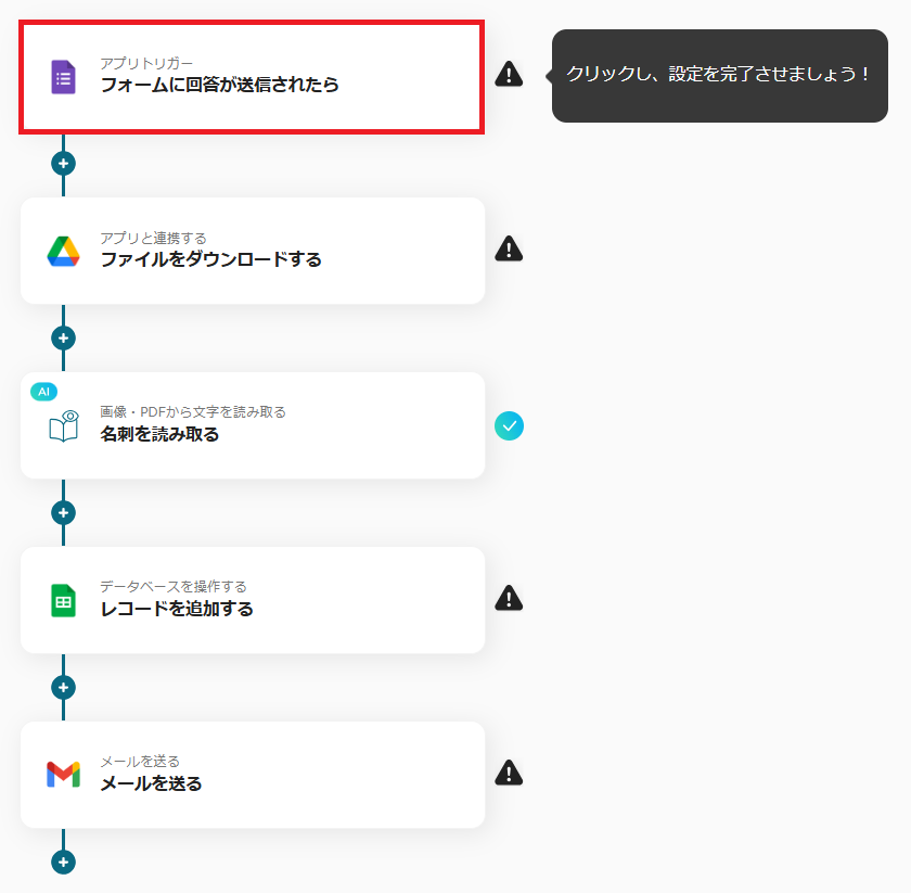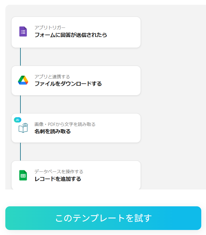 はじめに、Googleフォーム、Google Drive、Google スプレッドシート、GmailをYoomと連携します。 次に、トリガーでGoogleフォームを選択し、「フォームに回答が送信されたら」というアクションを設定します。 続いて、オペレーションでGoogle Driveの「ファイルをダウンロードする」アクションを設定し、フォームに添付された名刺画像をダウンロードします。 次に、オペレーションでOCR機能の「任意の画像やPDFを読み取る」を設定し、ダウンロードした名刺画像からテキスト情報を抽出します。 続いて、オペレーションでGoogle スプレッドシートの「レコードを追加する」を設定し、OCR機能で抽出した情報を指定のシートに追加します。 最後に、オペレーションでGmailの「メールを送る」を設定し、抽出したメールアドレス宛にお礼のメールを自動で送信します。 ※「トリガー」:フロー起動のきっかけとなるアクション、「オペレーション」:トリガー起動後、フロー内で処理を行うアクション