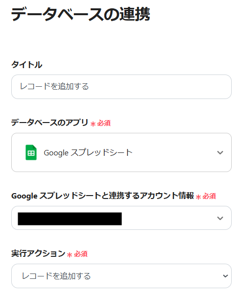 10.Google スプレッドシートと連携するアカウントを確認します。 ※その他の項目はデフォルトで設定されています。