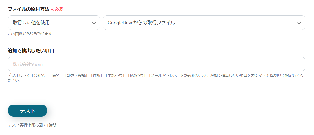 7.ファイルの添付方法を下記の画像のように設定し、追加で抽出したい項目を入力したらテストを行います。