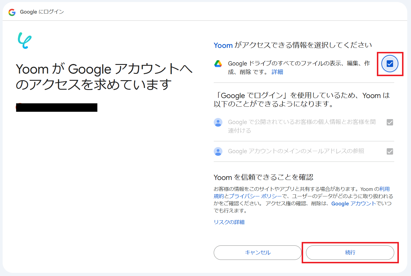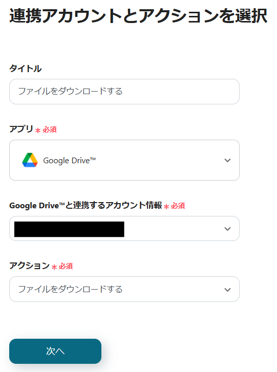 2.Google Driveと連携するアカウントを確認し、「次へ」をクリックします。 ※その他の項目はデフォルトで設定されています。