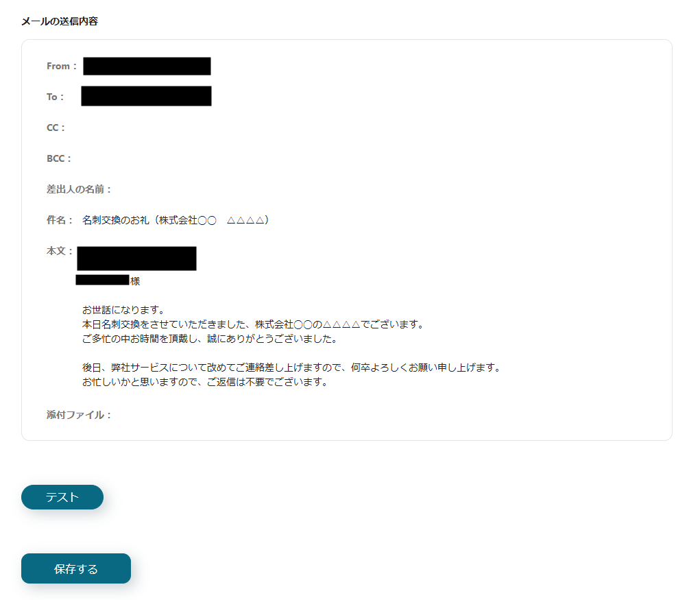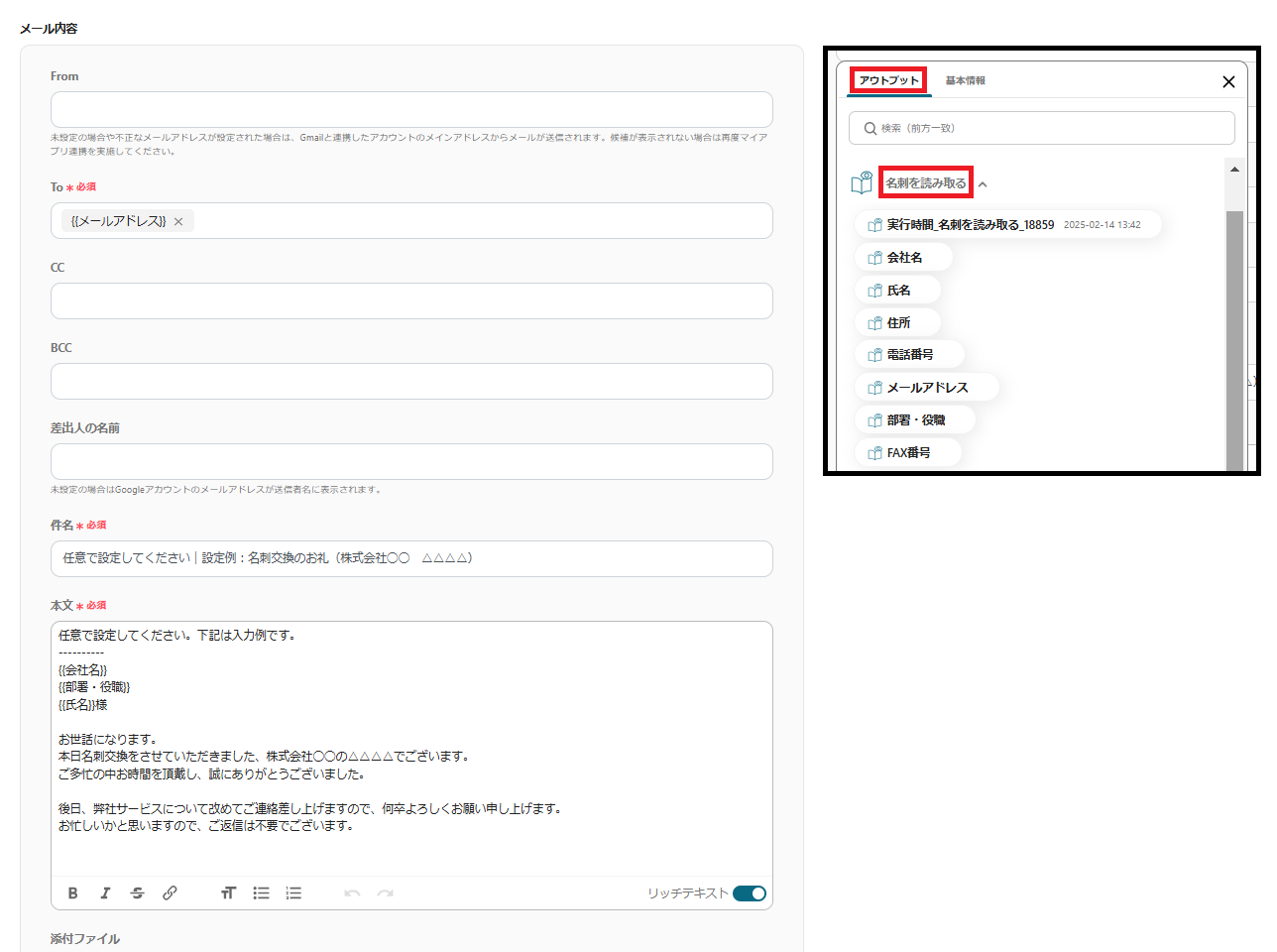 3.メール内容を設定します。 ※名刺画像から読み取った情報を反映させる項目は、枠をクリックして表示されるアウトプットの「名刺を読み取る」から設定します。(値は二重括弧で表示されます)件名と本文は、定型文を直接入力することもできます。
