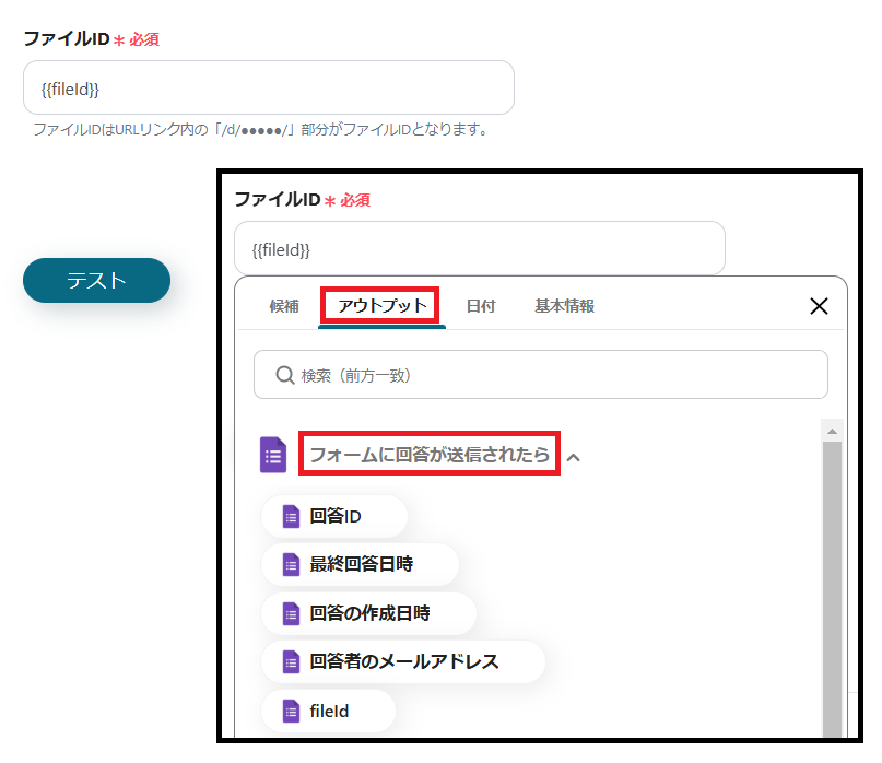 3.ファイルIDを設定してテストを行います。 ※ファイルIDは、枠をクリックして表示されるアウトプットの「フォームに回答が送信されたら」から設定します。(値は二重括弧で表示されます) ※ダウンロード可能なファイル容量は最大300MBまでです。アプリの仕様によっては300MB未満になる可能性があるので、ご注意ください。取り扱い可能なファイル容量の詳細はこちら をご確認ください。