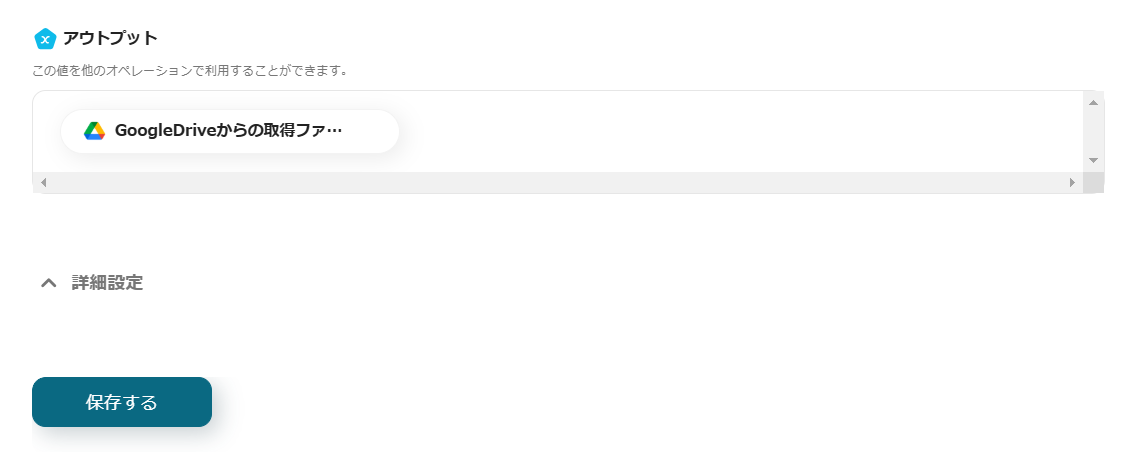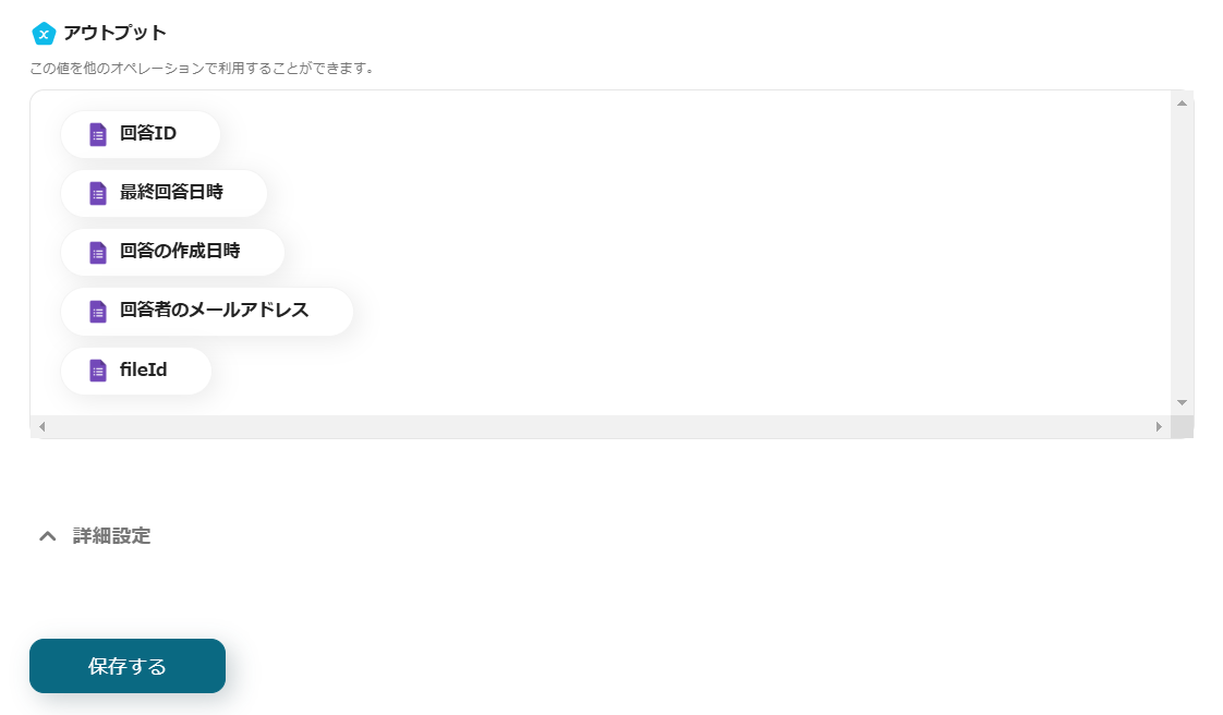 5.テストが成功したら、アウトプットに取得した情報を追加して保存します。 ※デフォルトで取得できるアウトプット(値)は仕様上、「回答ID」「最終回答日時」「回答の作成日時」のみとなっています。回答内容を追加する方法は、こちら のヘルプページを確認してください。