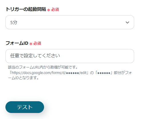 4.トリガーの起動間隔とフォームIDを設定してテストを行います。 ※トリガーの起動間隔は5分、10分、15分、30分、60分が用意されており、プランによって選択できる時間が変わります。選択した間隔ごとに一度、トリガーとなるアクションを確認し、実行された場合にフローボットが起動します。基本的に、短い間隔の設定がおすすめです。