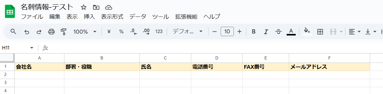 デフォルトで「会社名」「氏名」「部署・役職」「住所」「電話番号」「FAX番号」「メールアドレス」を読み取ります。Google スプレッドシートに反映する必要のない情報は、一旦読み取った後に精査することとなります。