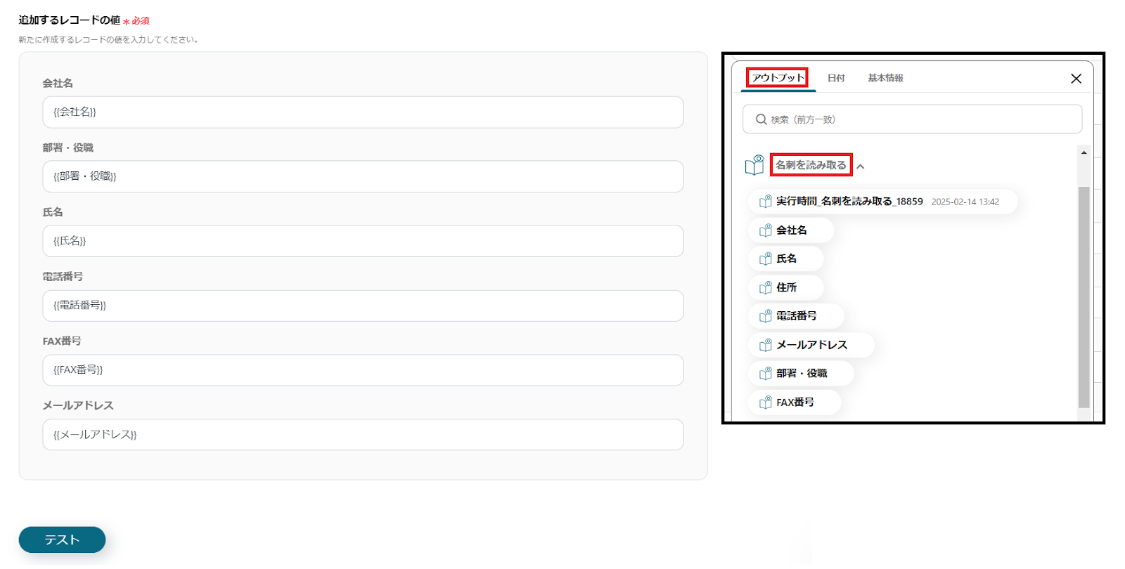 12.追加するレコードの値を設定してテストを行います。 ※名刺画像から読み取った情報を反映させる項目は、枠をクリックして表示されるアウトプットの「名刺を読み取る」から設定します。(値は二重括弧で表示されます)