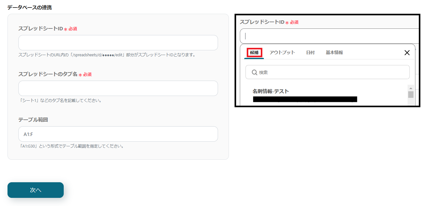 11.スプレッドシートID、スプレッドシートのタブ名、テーブル範囲を設定して「次へ」をクリックします。 ※スプレッドシートIDとスプレッドシートのタブ名は、枠をクリックして表示される「候補」から設定できます。