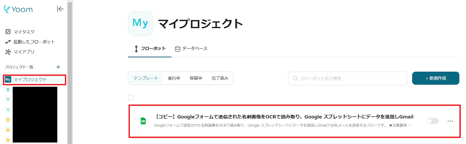 1.Yoom管理画面の「マイプロジェクト」を選択し、「【コピー】Googleフォームで送信された名刺画像をOCRで読み取り、Google スプレッドシートにデータを追加しGmailでお礼メールを送信する」をクリックします。 ※テンプレートのタイトルは次の画面で任意に変更できます。
