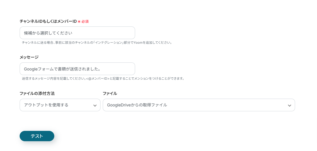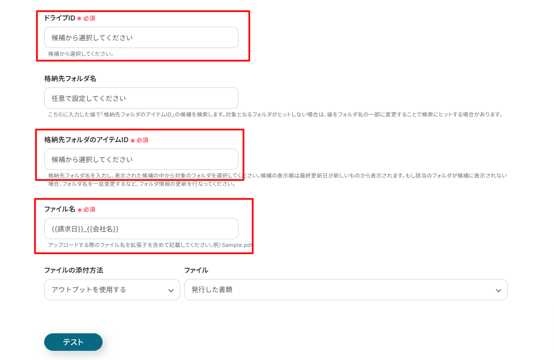 ファイルの添付方法はそのままにして「テスト」をクリックしてください。