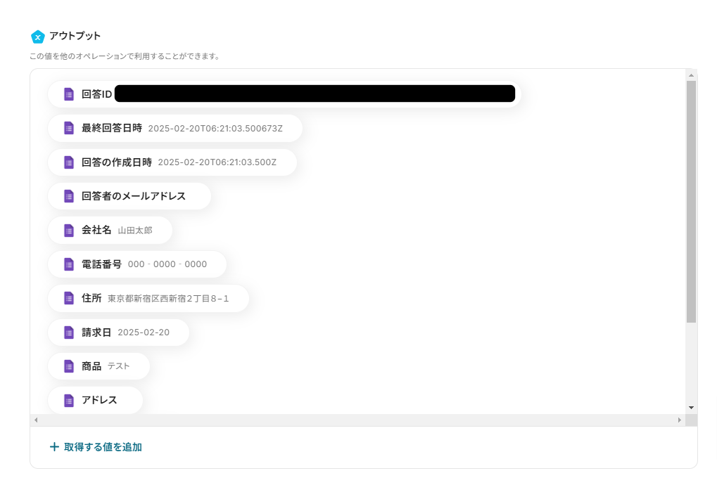 書類に必要な情報が不足していたら、こちらのページを参考に「+取得する値を追加」から操作してください。