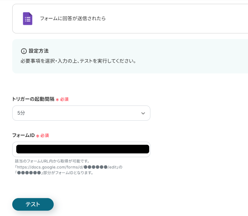 フォームIDをURLから取得したら、設定用にGoogle フォームで回答してから「テスト」をクリックしてください。