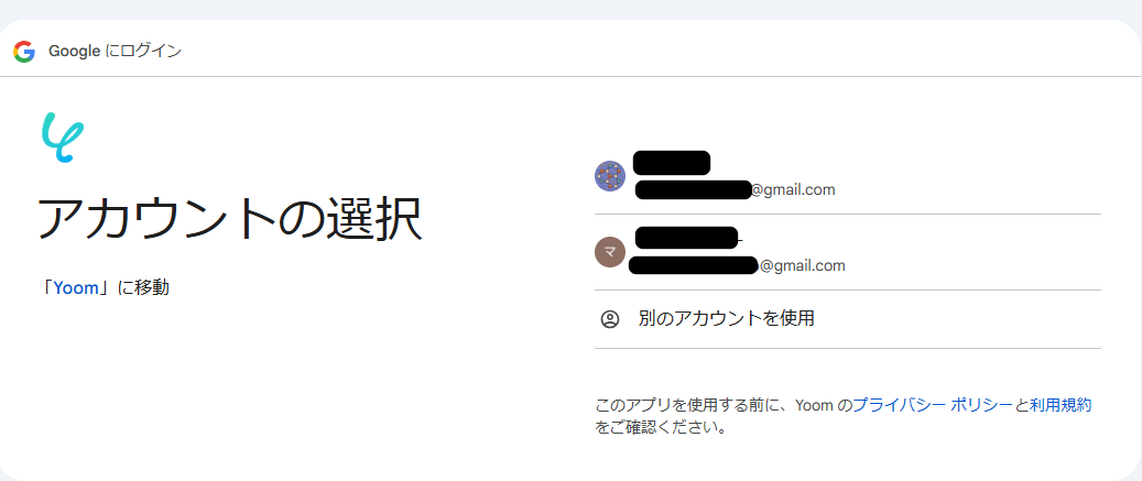 アカウント選択後にYoomにログインし、アクセスを許可します。