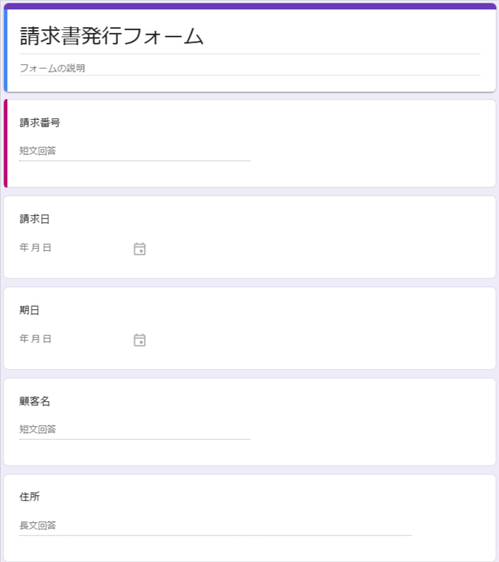 今回使用するGoogle フォームは、SaaSツールを提供している会社などで使用する請求書を想定したうえでフォームを作成しました。