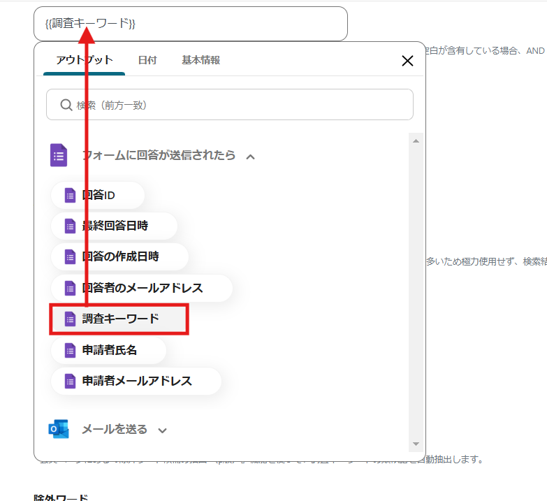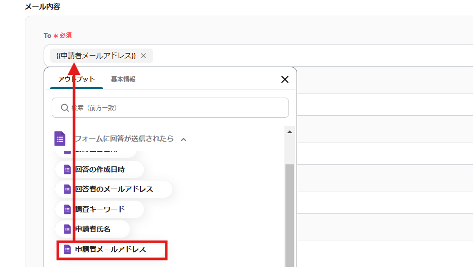 先ほど取得したGoogleフォームのアウトプット情報を活用して入力できます。