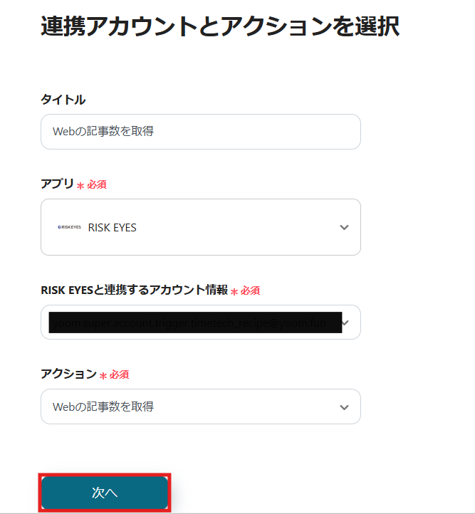 2) アクションは「Webの記事数を取得」を選択してデータベースIDを入力し、「次へ」をクリックします。