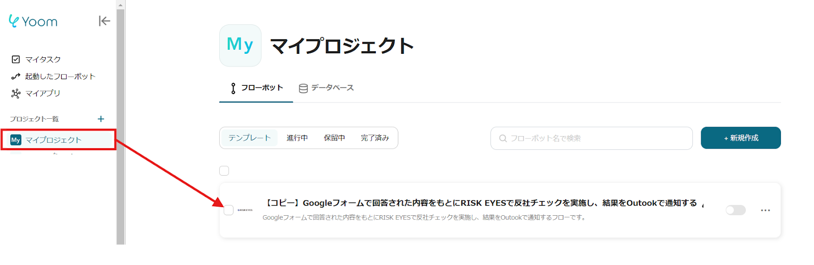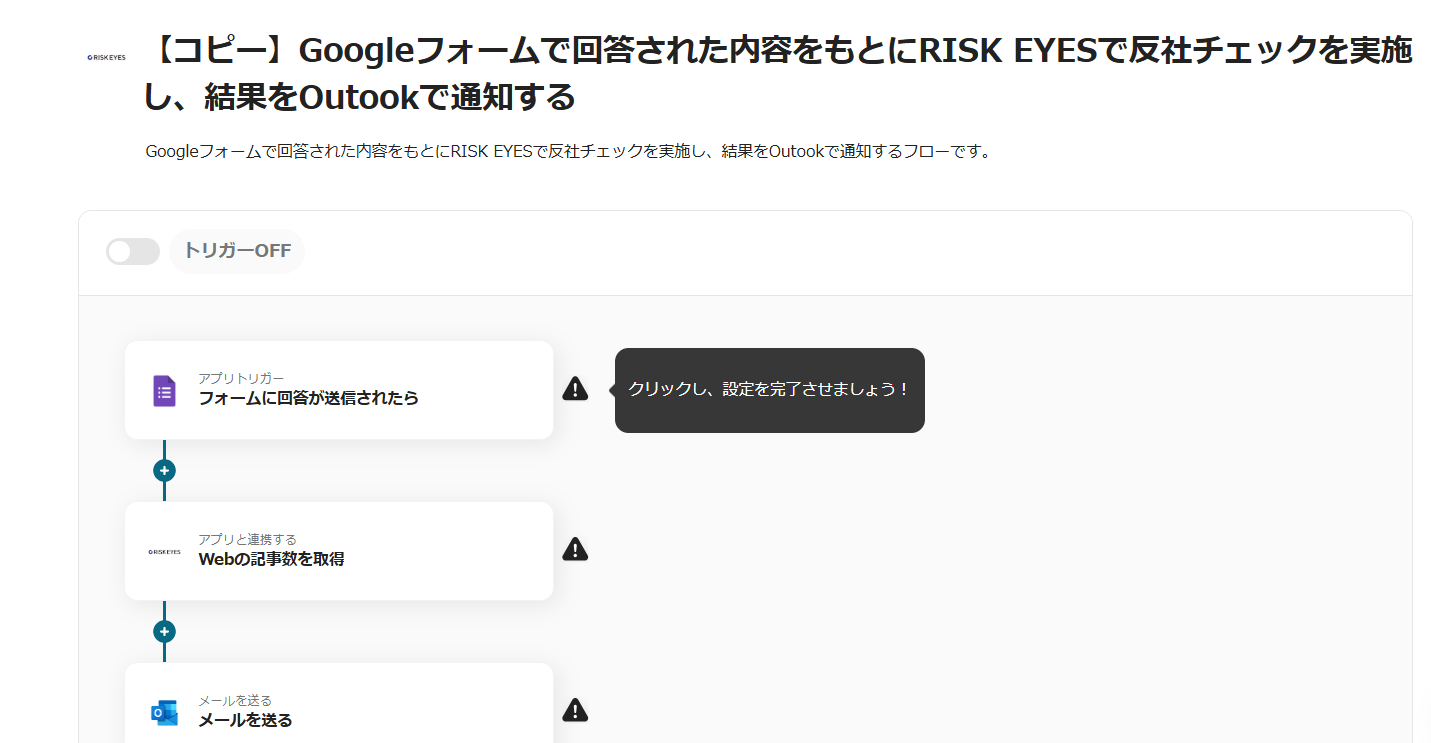 ここからは、Yoomのテンプレート【Googleフォームで回答された内容をもとにRISK EYESで反社チェックを実施し、結果をOutlookで通知する】という連携フローを使って設定をしていきます。