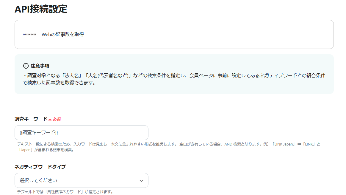 2.毎日指定の時間になったら、RISK EYESで指定したワードのWeb上の記事数を取得し、Slackに通知する