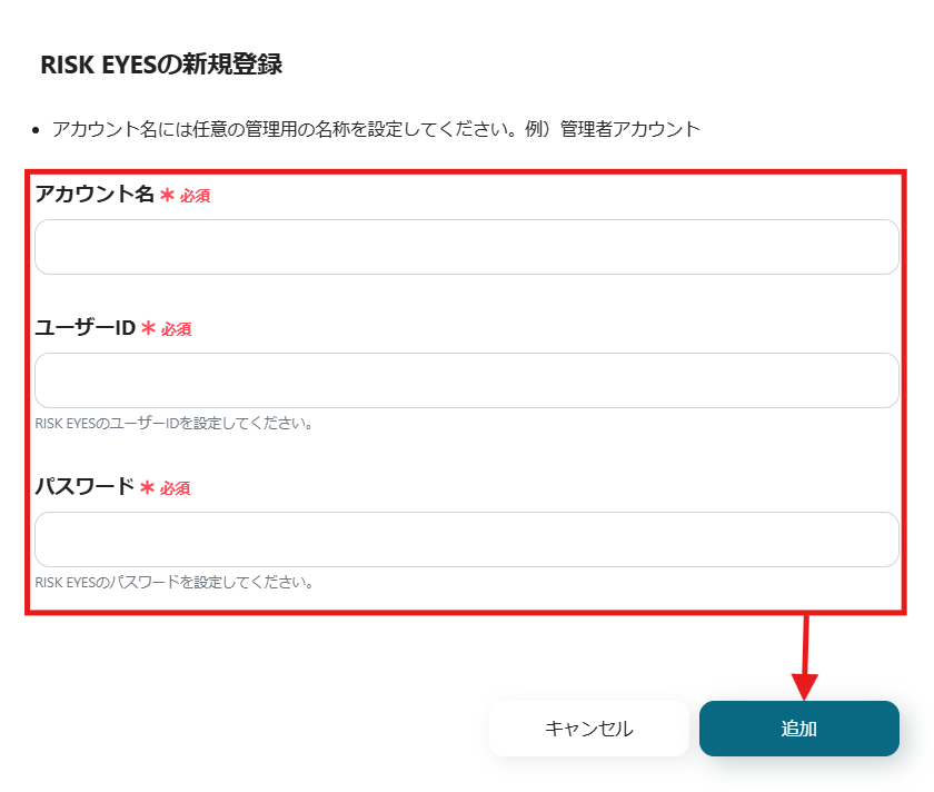 同様にRISK EYESを選択したら、アカウント名とユーザーID、パスワードを入力し、「追加」をクリックします。