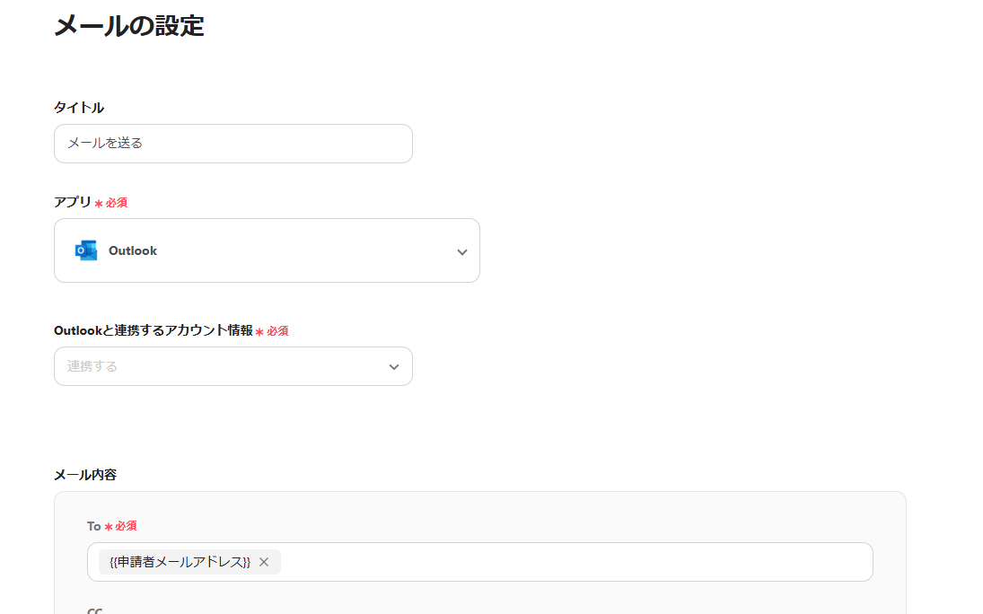 2) アクションは「メールを送る」を選択し、「次へ」をクリックして必須事項を入力します。