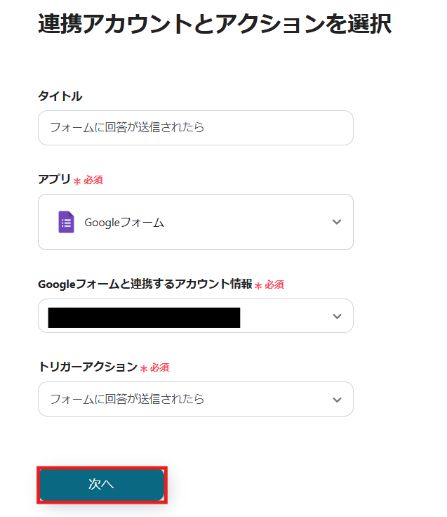1) アクションは「フォームに回答が送信されたら」を選択して、「次へ」をクリックします。