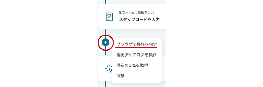 - 今回はスタッフIDを入力した後、確認画面に遷移するまでに、電話番号の入力を差し込んでみます。プラスボタンをクリックすると、操作メニューが開きます。