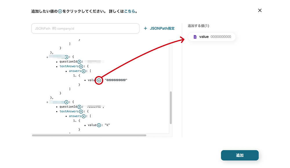 - アウトプット一覧の下にある「+取得する値を追加」をクリックします。JSONPath指定画面に切り替わります。