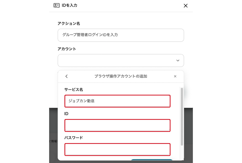 - 同様に、グループ管理者ログインIDの欄をクリックして「IDを入力」を選択し、表示された画面からジョブカン勤怠(サービス名)を選択します。