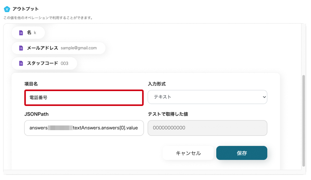 - 例えば、電話番号を追加した場合、標準のアウトプット一覧には表示されませんが、このJSONPath内から項目を取得することで、表示できます。