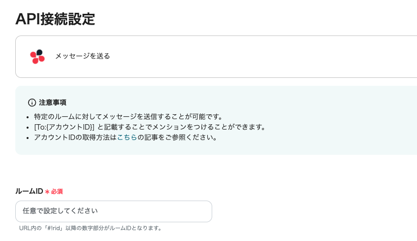 - 編集欄をクリックすると、ルームの候補が表示されます。通知を行うルームを選択するとIDが引用されます。もしくは、Chatworkのルーム設定から確認する方法でIDを取得いただけます。