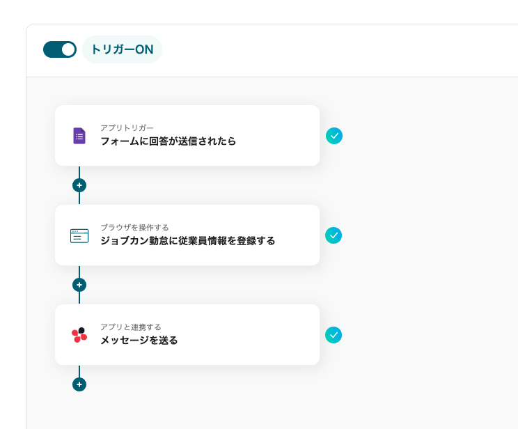 Googleフォームから送信された情報がジョブカン勤怠に登録されると、すぐにChatworkで関係者に通知が届きます。これにより、登録内容や進捗状況をスムーズに把握できます。Chatworkの通知があれば、登録が完了したことをすぐに確認できるため、担当者も安心できます。さらに、通知の内容はカスタマイズできるので、Googleフォームで入力された情報を定型文に含めることで、登録内容の整合性をその場でチェックしやすくなります。採用担当者は、新入社員の情報をジョブカン勤怠に登録したあと、きちんと反映されているかを確認し、チームと共有することがあります。このフローを導入すれば、登録完了のタイミングでChatworkに自動通知が届くので、情報の伝え漏れを防ぎながら、登録内容の正確性を高めるのにも役立ちます。