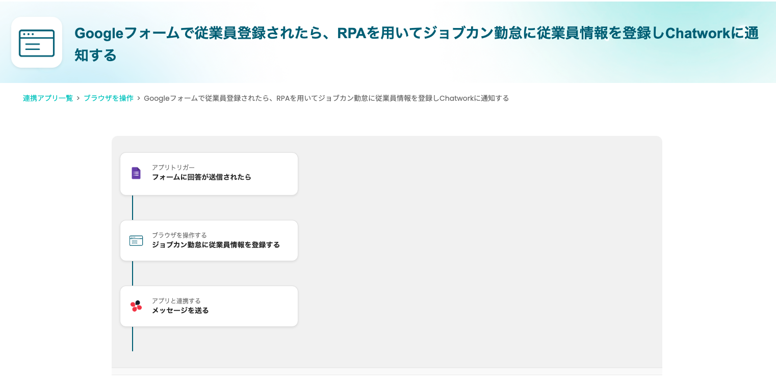 ここからは、「Google フォームで従業員登録されたら、RPAを用いてジョブカン勤怠に従業員情報を登録し、Chatworkに通知する」の設定方法を、Yoomのフローボットテンプレートを使って解説します。