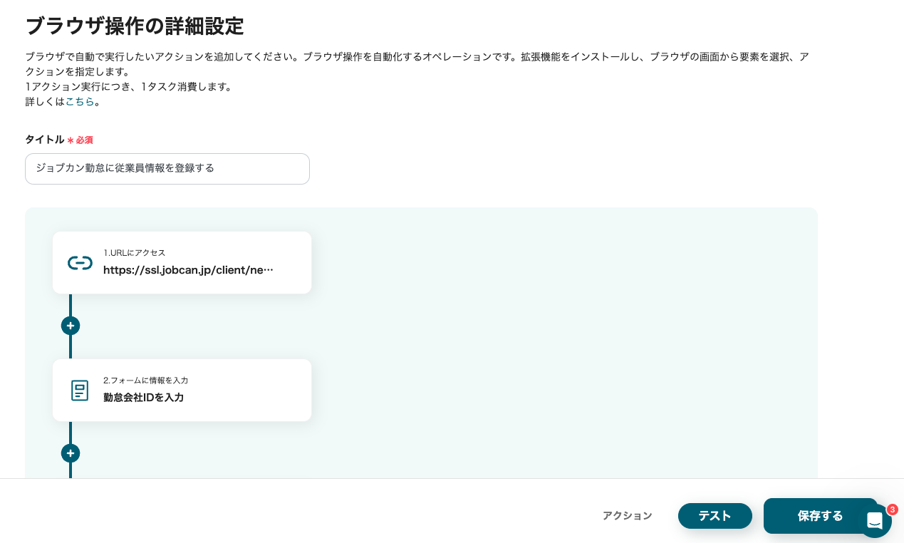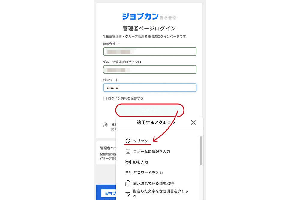 - 2つ目以降のアクションは、下へスクロールすると確認できます。まずはジョブカン勤怠にログインします。