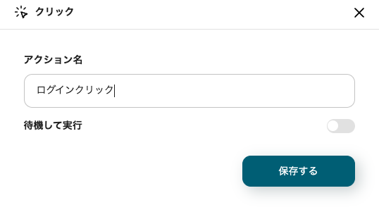 - アクション名を入力する画面が表示されるので、ログインするを入力して保存をしましょう。