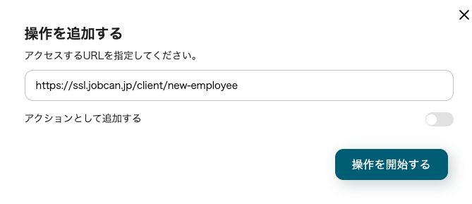 - ジョブカン勤怠のスタッフ登録画面のURL「https://ssl.jobcan.jp/client/new-employee」を入力します。