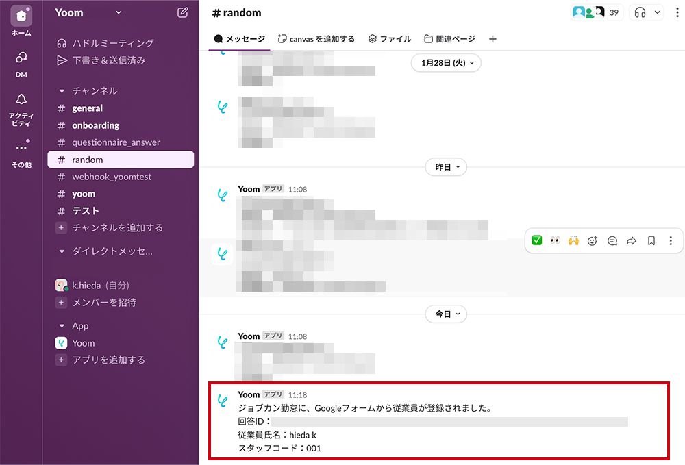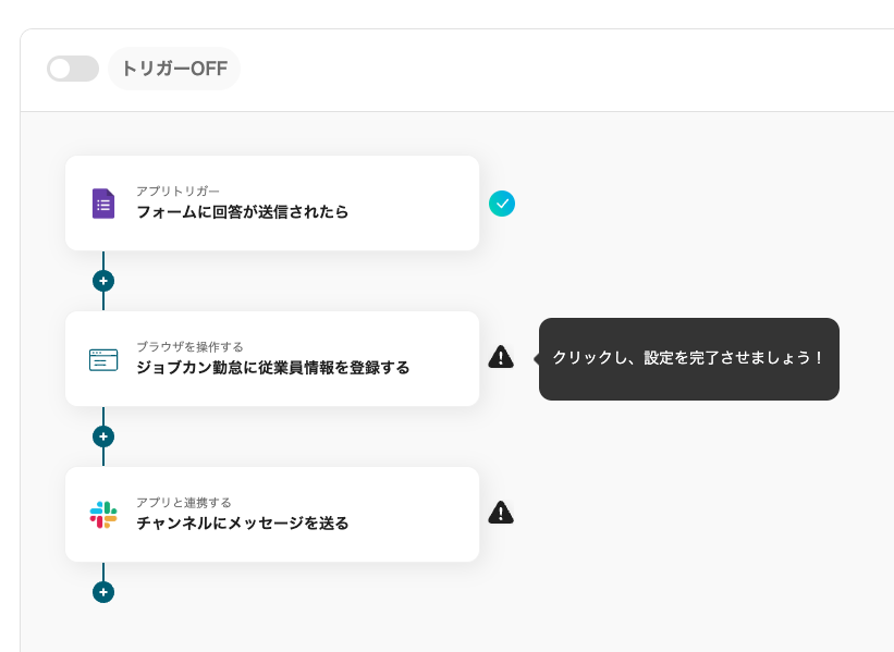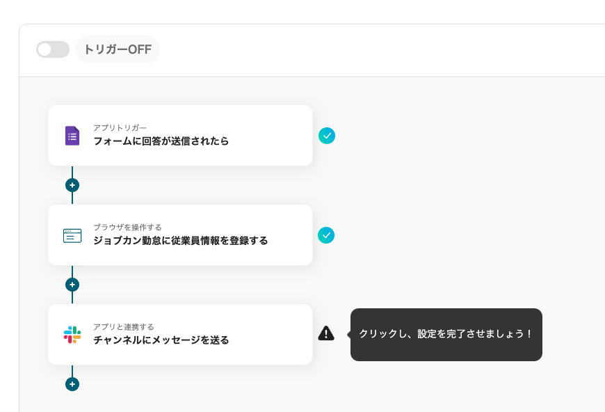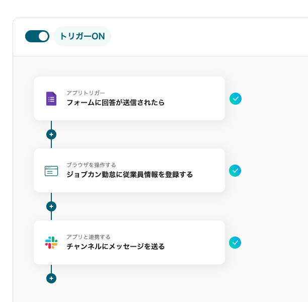 この自動化では、Google フォームで入力した情報がそのままジョブカン勤怠に転記されるので、手作業の入力ミスを防げます。登録が完了すると、Slackの通知で状況をすぐにチェックできます。