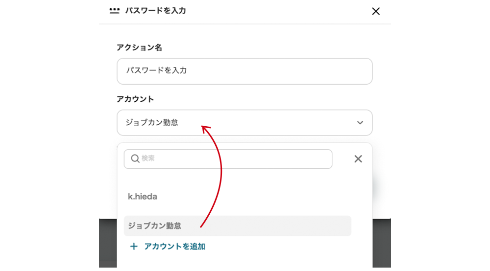 - 3.で入力した情報が引用できます。アカウントのプルダウンメニューを開くと、先ほどIDとパスワードを入力したジョブカン勤怠(サービス名)が表示されますので、選択しましょう。