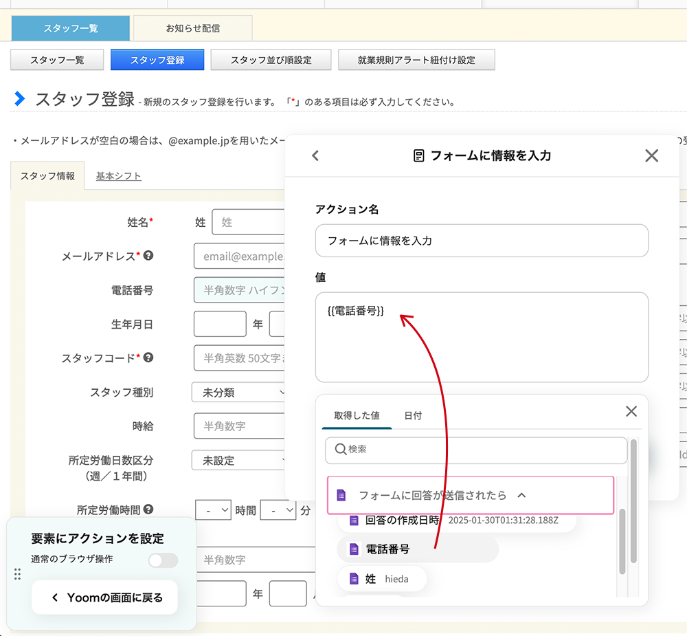 - アクションの操作画面が表示されます。値の欄をクリックすると、Google フォームから取得した項目が表示されるので、選択すると引用コードが埋め込まれます。