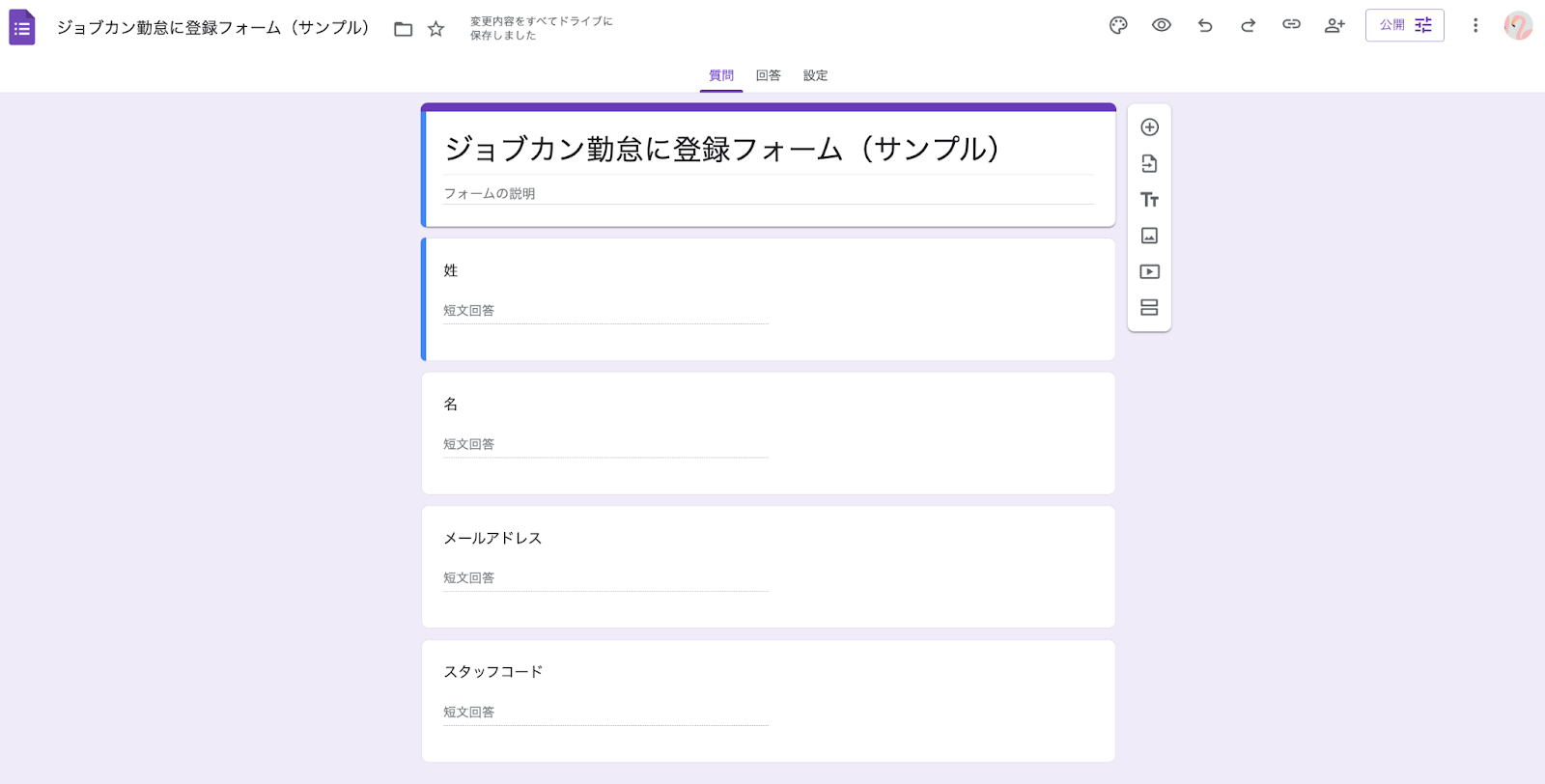 - 姓名とメールアドレスはジョブカン勤怠の登録上必須項目のため、Google フォームの項目に必ず追加してください。