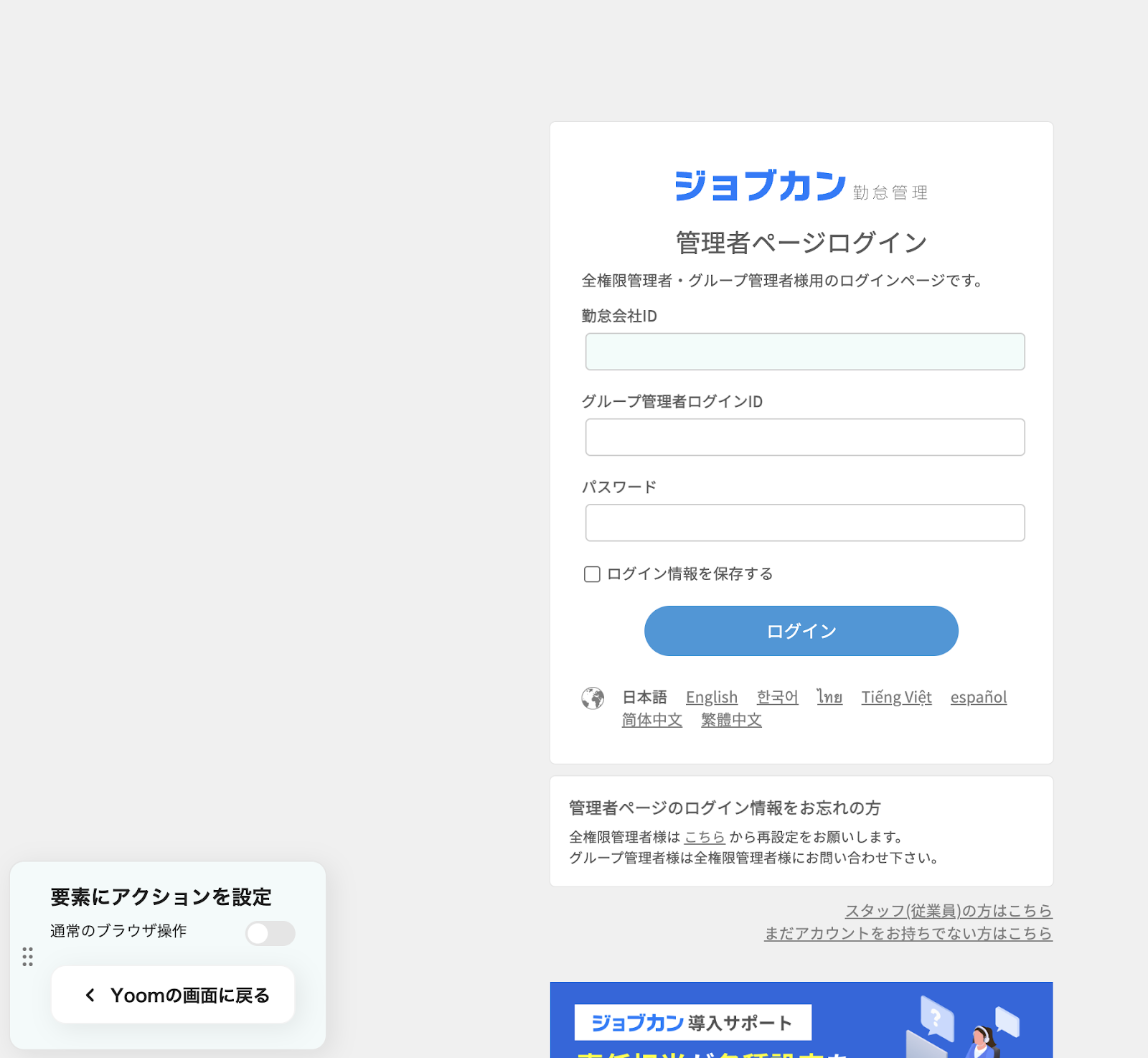 - ジョブカンのログイン画面が表示されます。左下に「要素にアクションを設定」と表示されたバナーが表示されていると、Yoomのブラウザ操作中の証です。