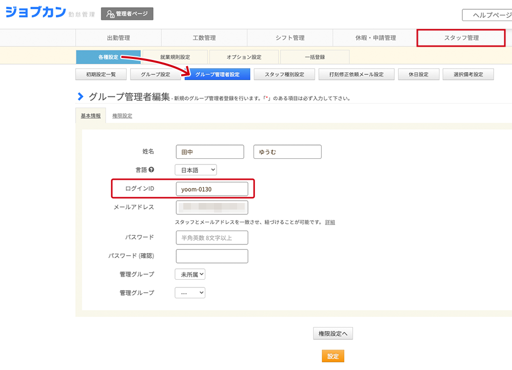 - 同じくジョブカン勤怠の管理画面から取得します。上部メニュー【スタッフ管理】/各種設定/グループ管理者設定…に進んで表示された画面からログインIDを取得できます。パスワードは表示されていないので、わからない場合は再設定で取得してください。