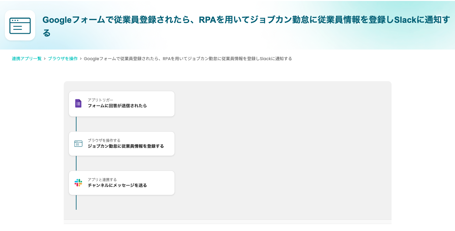 ここからは、「Google フォームで従業員登録されたら、RPAを用いてジョブカン勤怠に従業員情報を登録し、Slackに通知する」の設定方法を、Yoomのフローボットテンプレートを使って解説します。