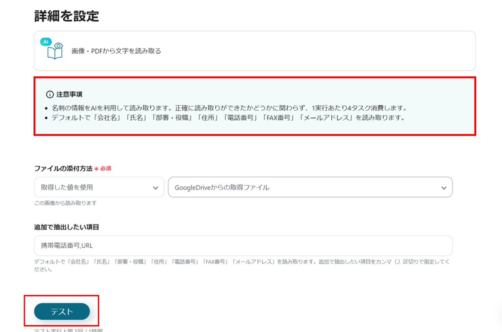 選択が完了したら、下部にある「テスト」をクリックし、エラーが発生しなければ、「保存する」をクリックします。