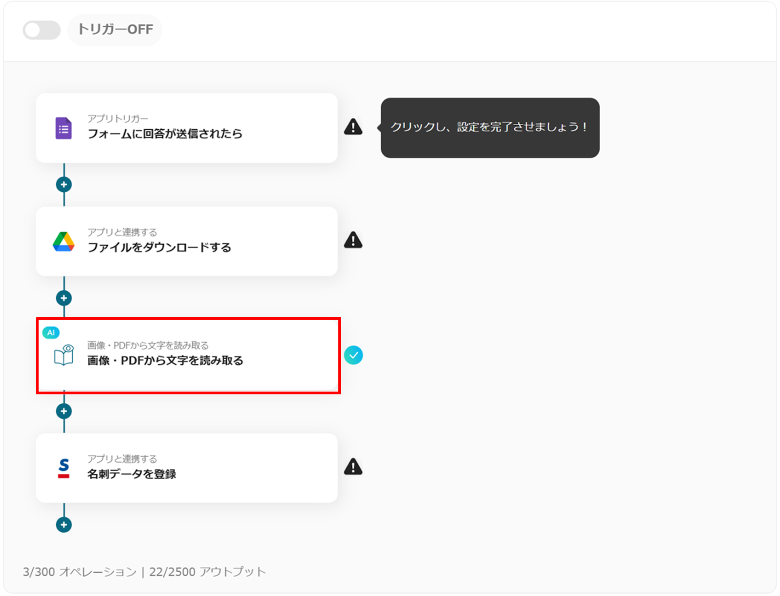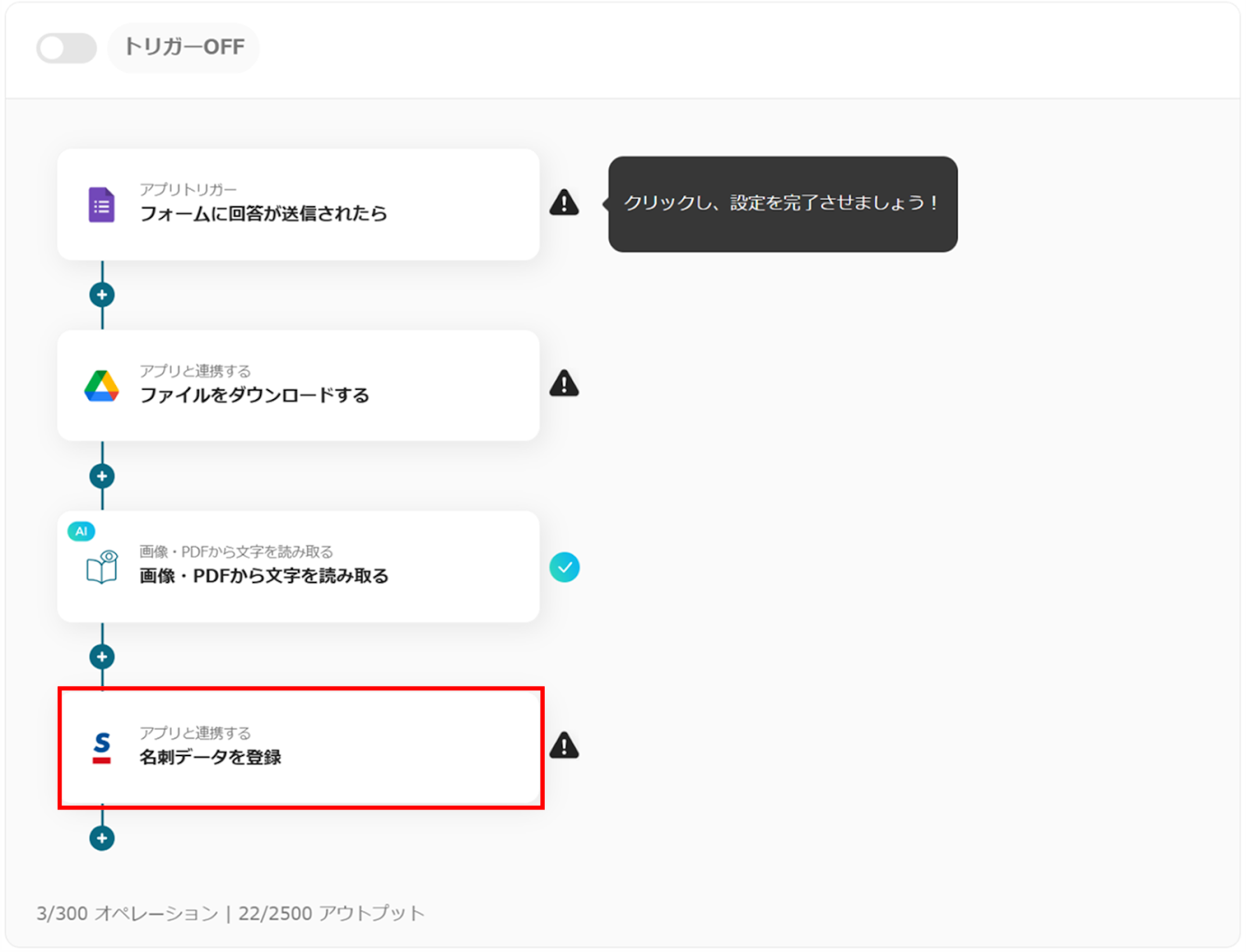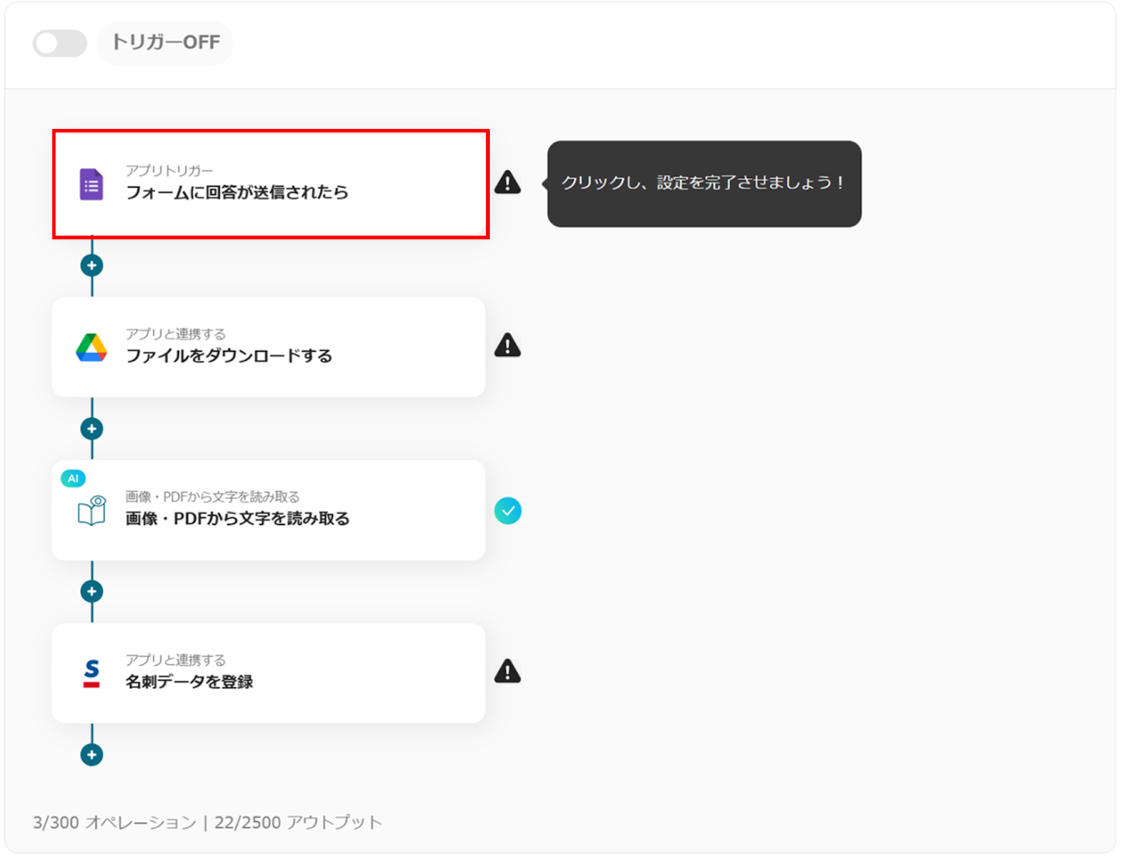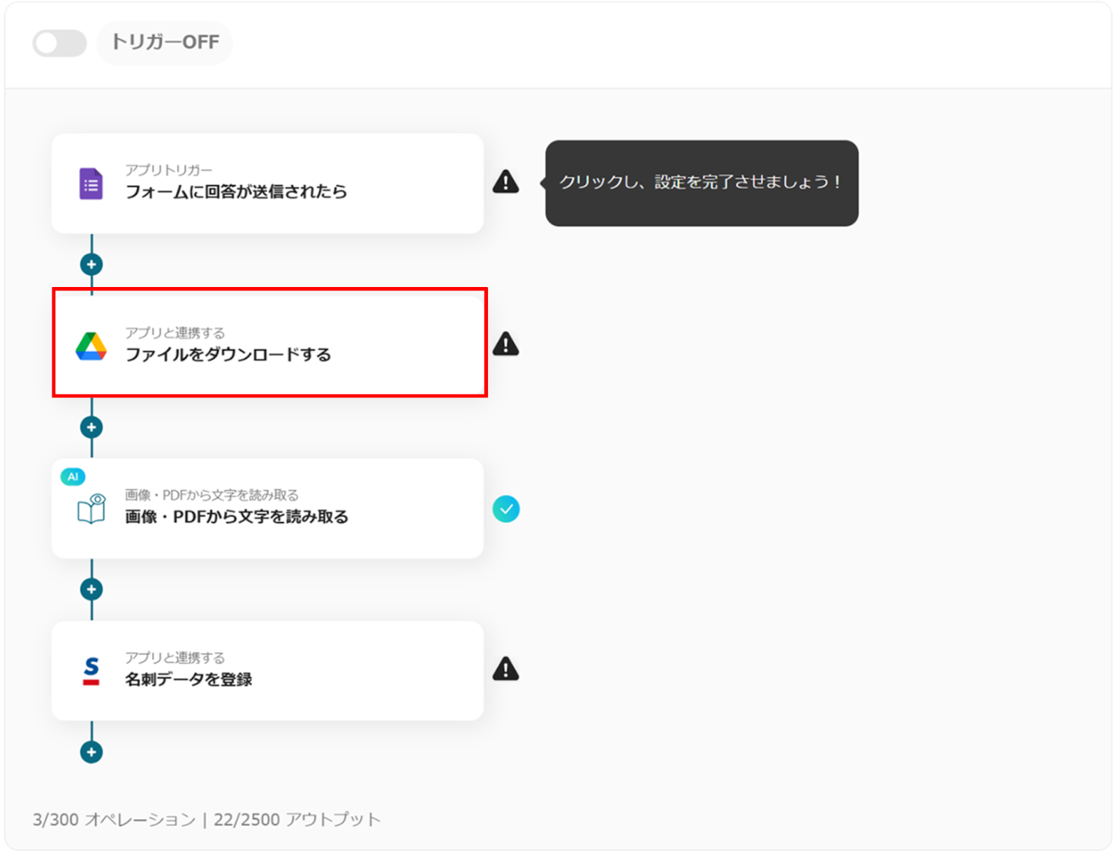 これで、「Googleフォームで送信された名刺画像をOCRで読み取りSansanに登録する」フローボットの完成です。