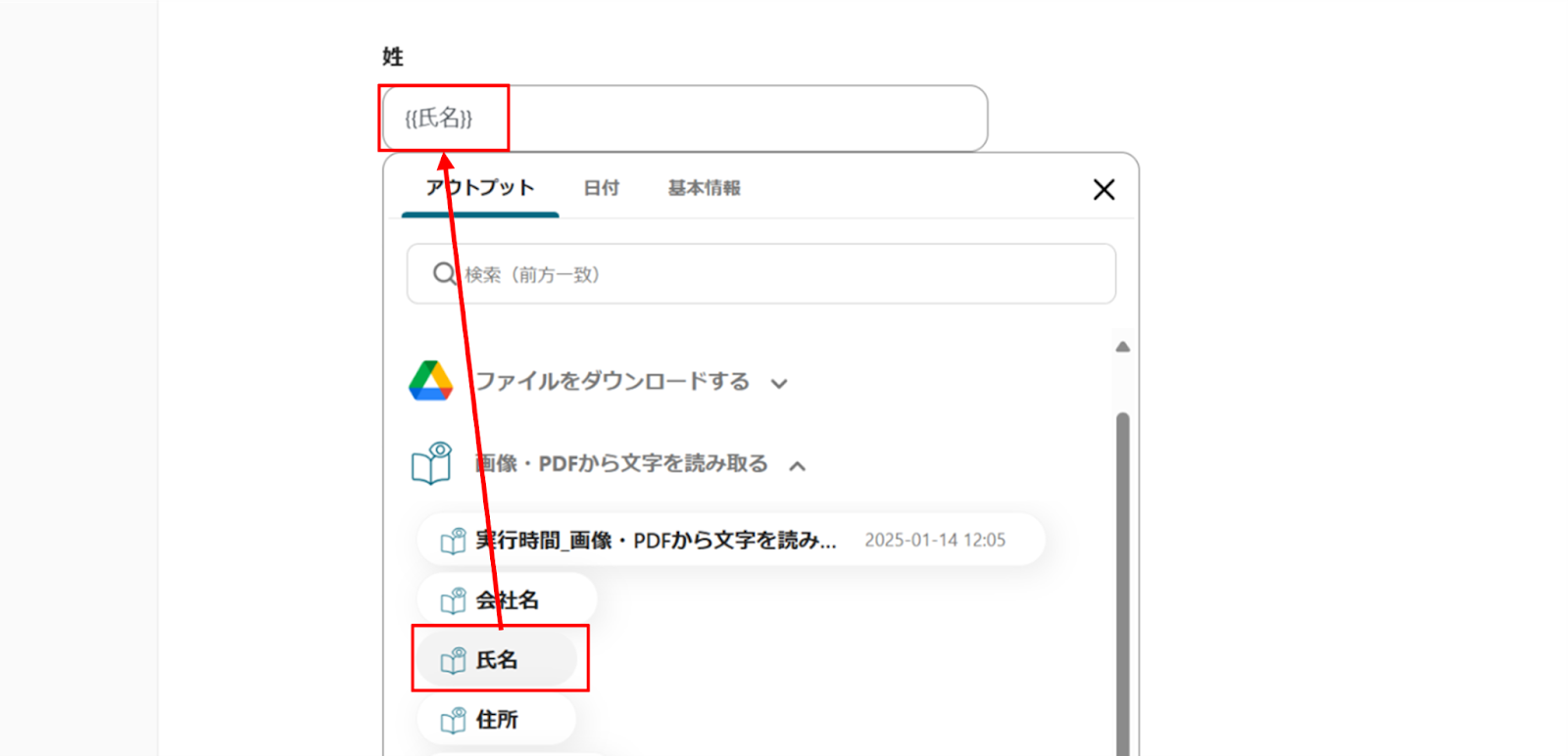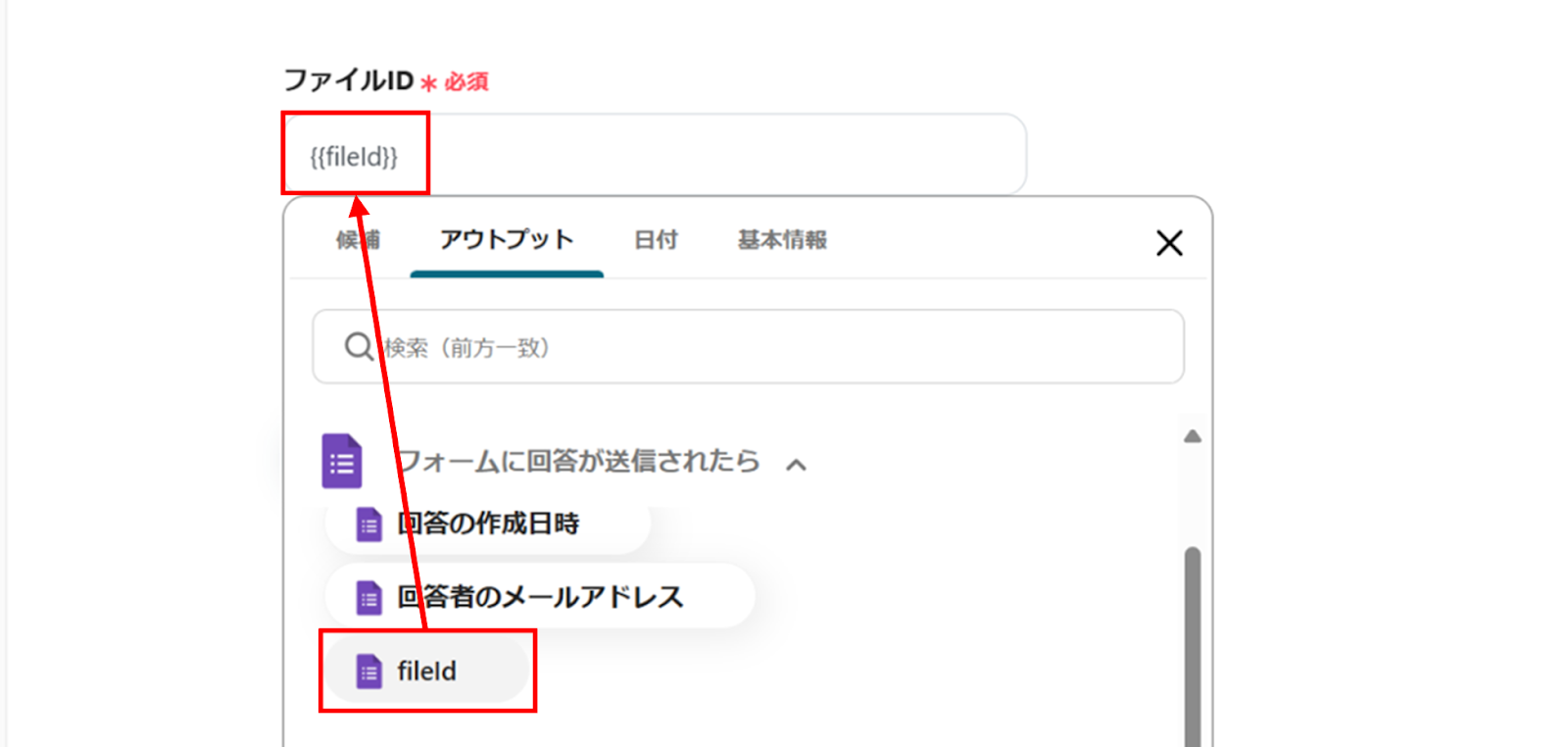 (6)「API接続設定」画面から、アウトプットを使って「fileId」を選択します。