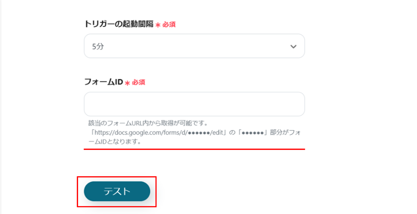 入力が完了したら、「テスト」をクリックし、エラーが発生しなければ、「保存する」をクリックします。