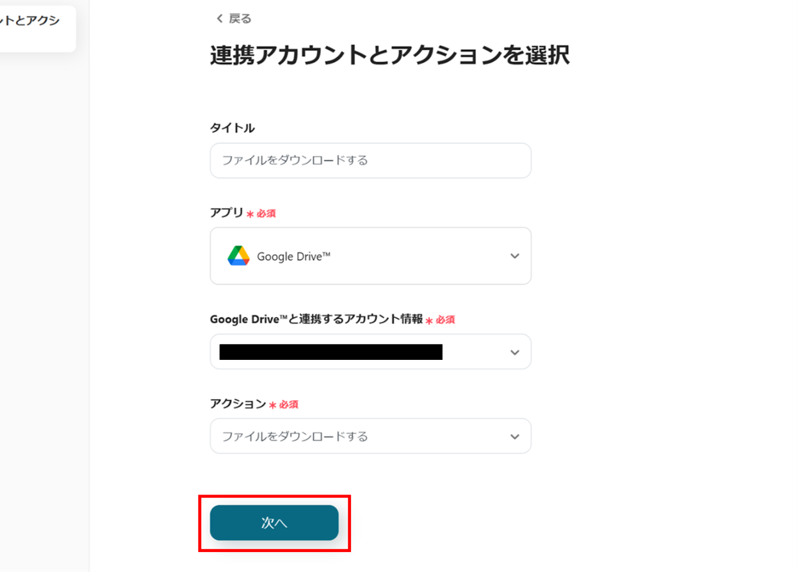 (5)Google Driveの「連携アカウントとアクションを選択」画面から、Google Drive™と連携するアカウント情報に誤りがないかを確認し、アクションは「ファイルをダウンロードする」のままで「次へ」をクリックします。