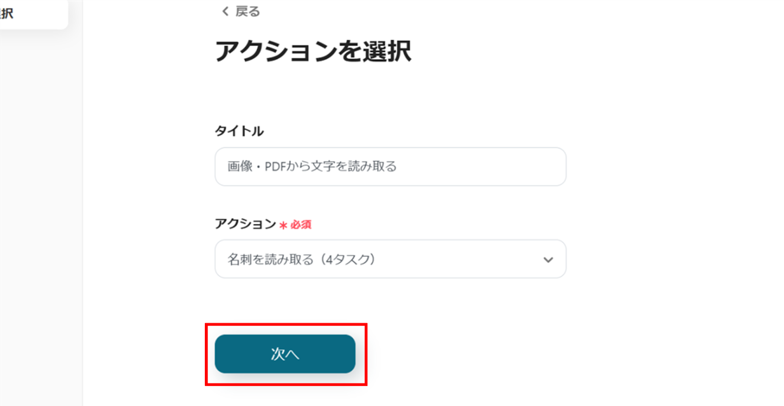 (2)「アクションを選択」画面から、タイトルは「画像・PDFから文字を読み取る」のままで、アクションは「名刺を読み取る」を選択します。