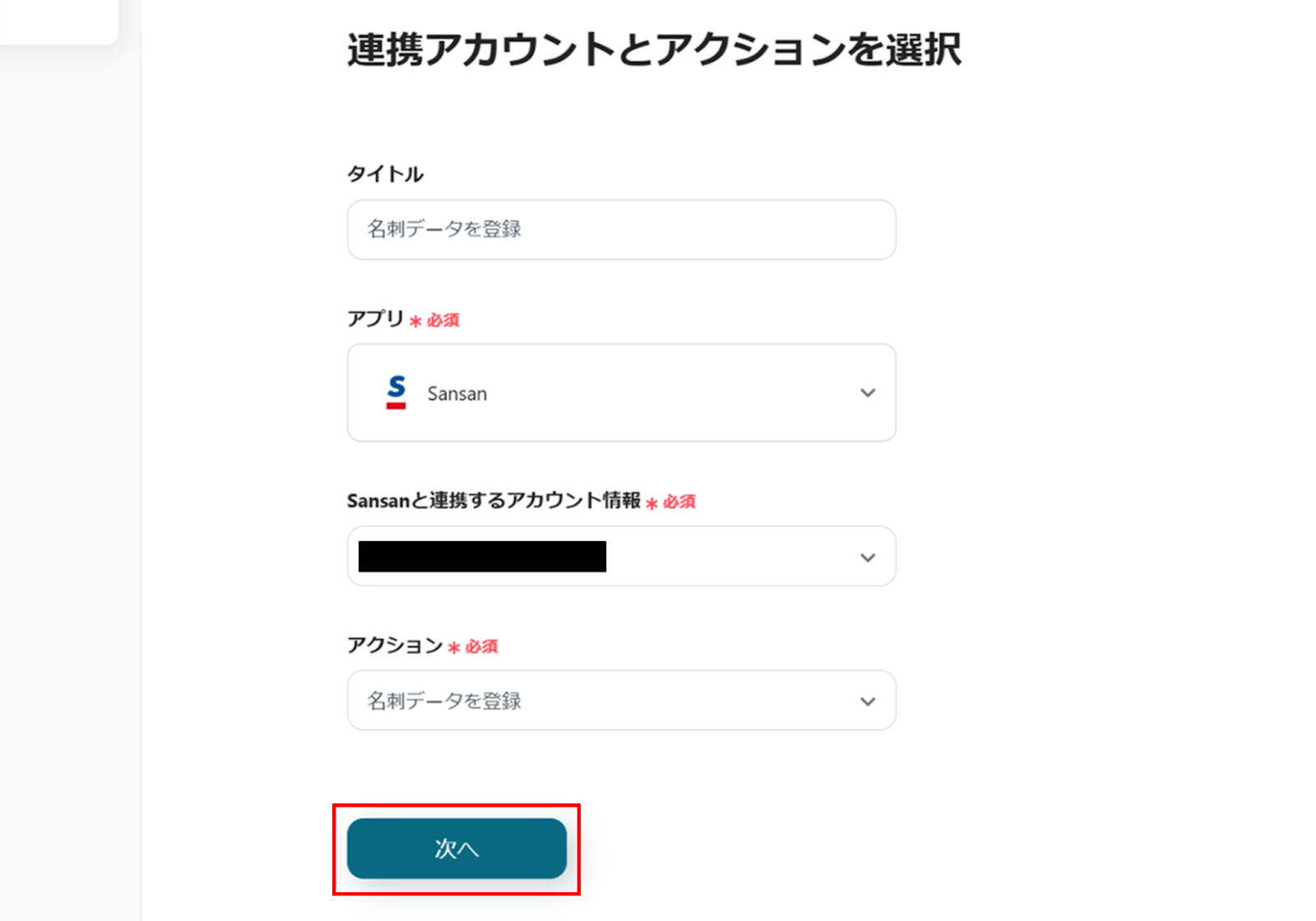 (2)Sansanの「連携アカウントとアクションを選択」画面から、Sansanと連携するアカウント情報に誤りがないかを確認し、アクションは「名刺データを登録」のままで「次へ」をクリックします。