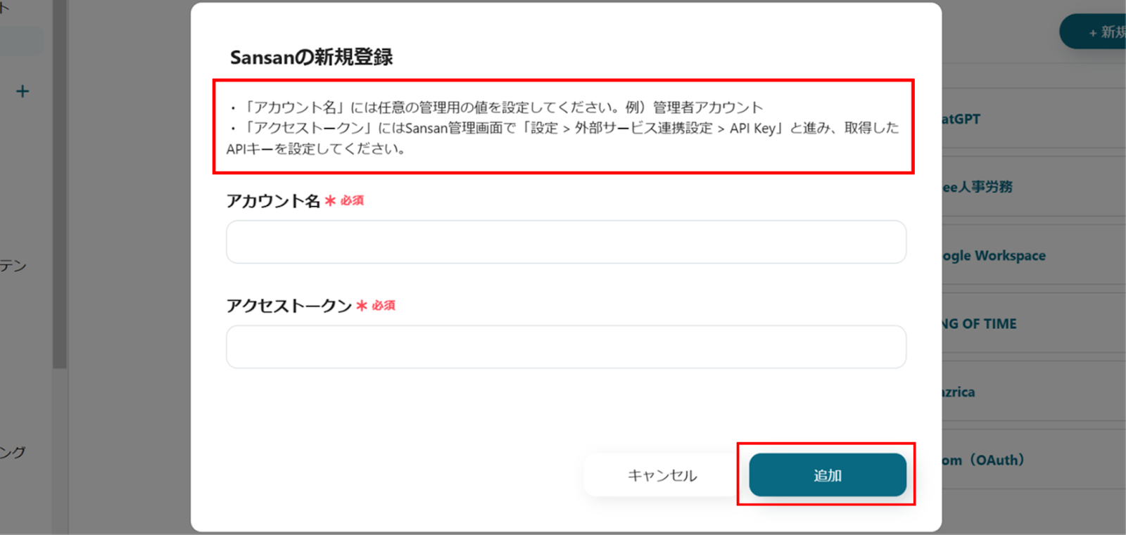 (6)「Sansanの新規登録」画面から赤枠を確認の上、アカウント名、アクセストークンを入力します。