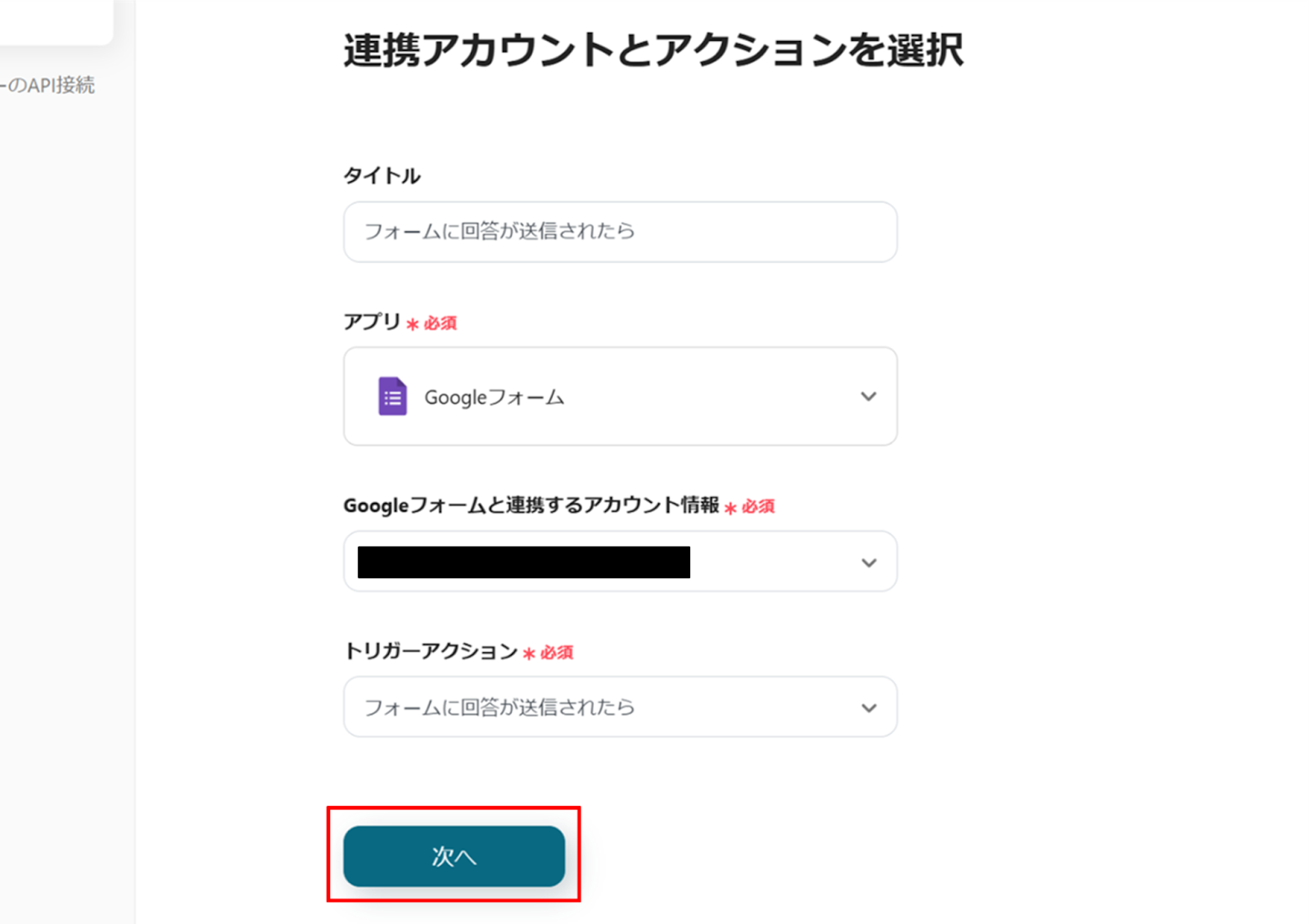 (2)Googleフォームの「連携アカウントとアクションを選択」画面から、Googleフォームと連携するアカウント情報に誤りがないかを確認し、トリガーアクションは「フォームに回答が送信されたら」のままで「次へ」をクリックします。